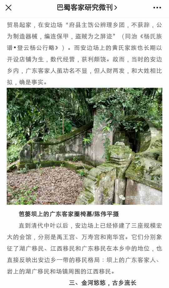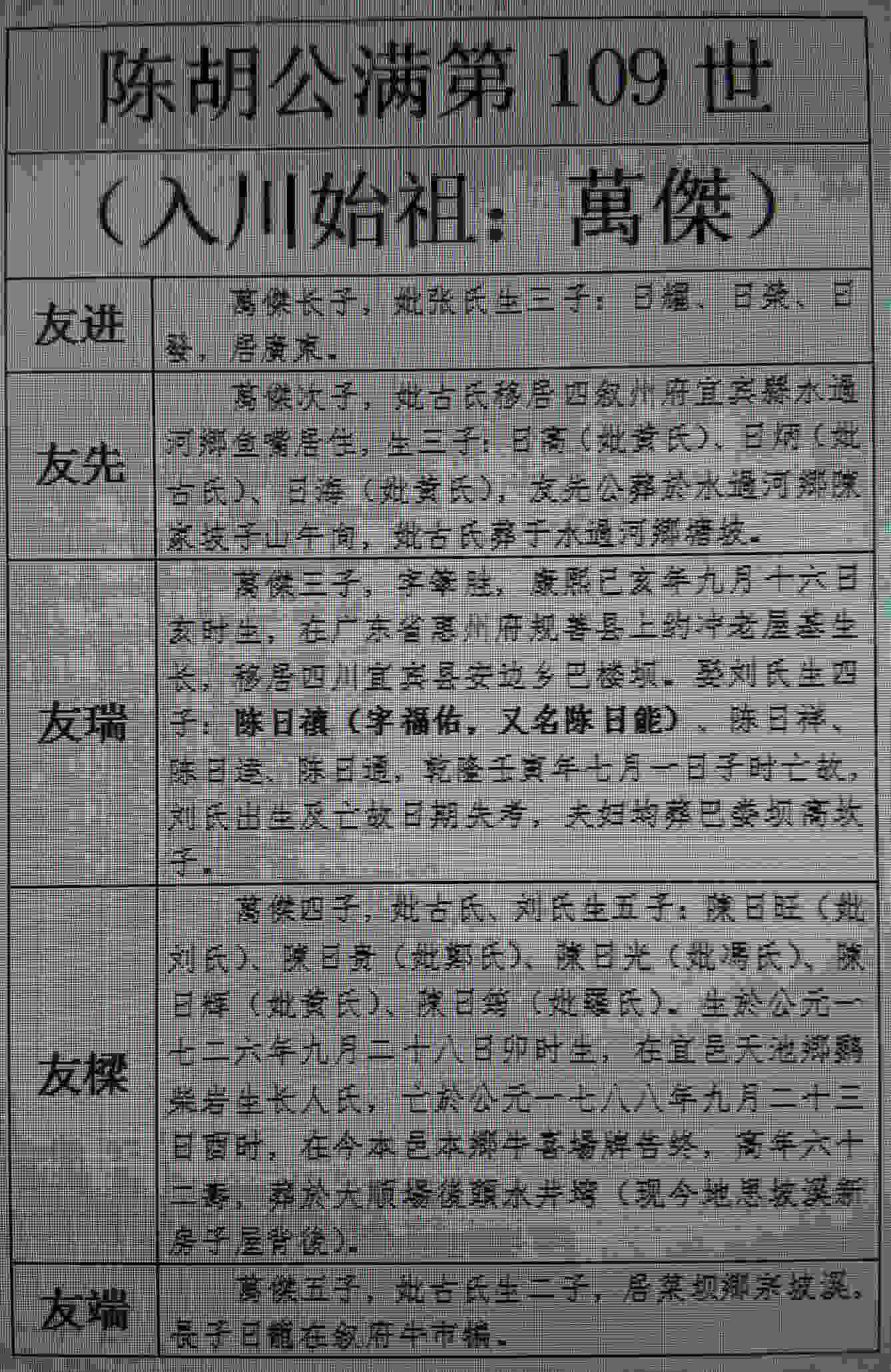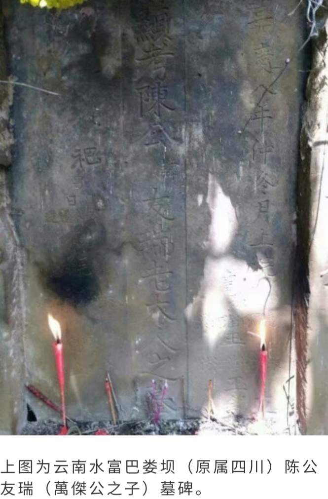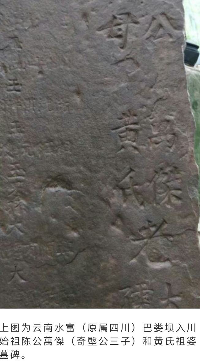 编者按语:近悉,川南陈氏宗亲会顾问陈伟平宗亲不辞辛劳,冒着夏日的高温和酷暑,亲临四川省宜宾市叙州区横江镇陈湾头及云南省水富市巴娄坝,与广东兴宁横岗奇壂公入川后裔强鸣(继鸣)及继立等宗亲一道,为弘扬陈氏移民文化和打造客家古村落而考察陈氏奇壂公后裔的祖先(友先、友瑞等)墓地、祠堂和族谱。笔者拜读伟平宗亲撰写并刊载于巴蜀客家研究微刊的《川滇之交:金江下游安边乡的广东客家移民》一文后,很受感动。特以文中内容及人物,以“巴蜀客家载移民,友先友瑞广东陈”为题,点赞而转发,全文如下: