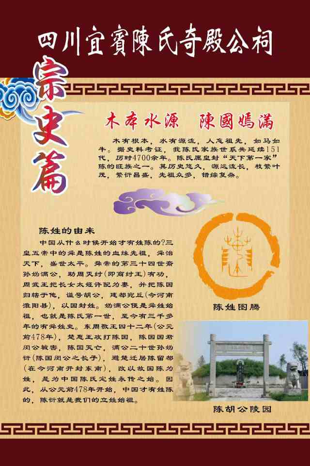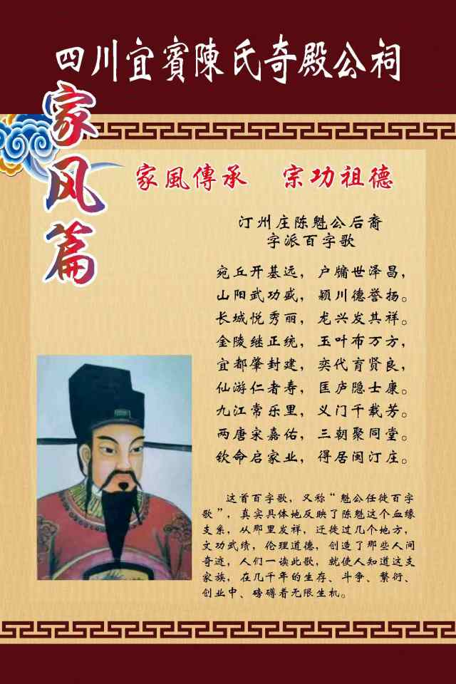 有祠堂祭祀、有族谱传承,纵然走到天涯海角,任凭风高浪急,子子孙孙都知道根在哪里,起点在哪里。按照设想,我们的陈氏奇壂公祠,在设置先祖神位这一板块后,还应有体现我们陈氏起源、颍川陈氏、义门陈氏、迁徙入粤和因湖广填川而入川开基及天官维周、谱载源流和家规、家训等八大板块的内容。这样,才能体现我们陈氏奇壂公祠的特色和深厚底蕴的文化内涵。从而起到传承文化、启迪后人的历史意义和作用。对此,我们深感任重道远,责任重大。