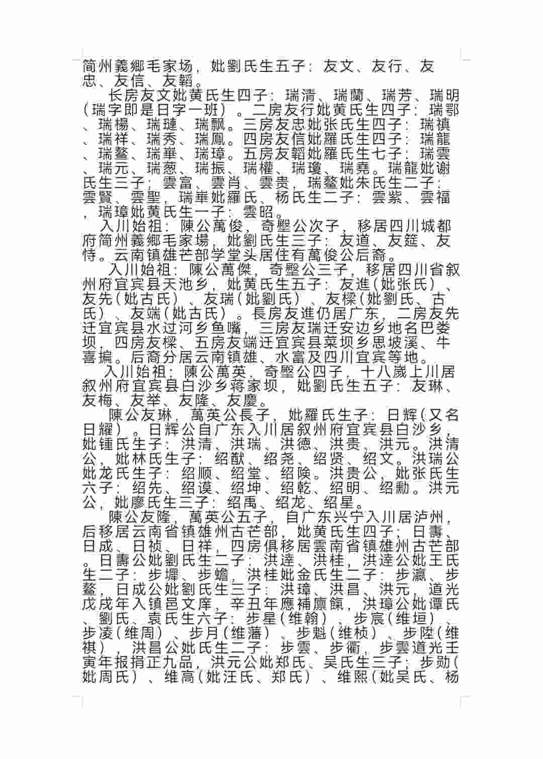 玖世祖陳公德佑,文興公之子,妣馮氏生子陳景興,德佑公葬於白石巳山亥向,冯氏葬於鹁鸠田癸山丁向。 拾世祖陳公景興,德佑公之子,妣羅氏、趙氏生子:陳金勝,景興公葬於铺心塘,趙氏葬於松樹山行,羅氏葬於坪輋肚。 拾壹世祖陳公金勝,景興公之子,妣黄氏生二子:陳元、陳亨,金勝公葬於白墓前,黄氏葬於劉坡峯,陳元妣劉氏生子陳法行,分居神背。 拾贰世祖陳公亨,金勝公次子,妣劉氏生子道政,亨公葬於陳钵田下屋侧,劉氏葬於坪坑裡。 拾叁世祖陳公道政,亨公之子,妣劉氏生四子:陳寿、陳南、陳兆、陳庆,陳寿後裔仍住原邫,陳庆後裔有住原邫,有上四川简州居住毛家场者。 拾肆世祖陳公兆,道政公三子,妣锺氏、黄氏生二子:陳文儒、陳文美,兆公葬於石子岡,黄氏葬於社背,锺氏葬於河塘隔,文儒後裔未及備録。拾伍世祖陳公文美,兆公次子,妣劉氏生二子:陳應璝、陳應璋(字,陳仕廷),文美公葬於南坑,劉氏葬於石子岡,應璋後裔未及備録。拾陆世祖陳公應璝,字,玉廷,文美公次子,妣葉氏生二子:陳习颜(字,陳衷贤)、陳习思(字,达贤),應璝公葬於白墓前禾坪角上,葉氏葬於灣裡,习思後裔未及備録。 拾柒世祖陳公习颜,應璝公長子,妣赖氏、曾氏生六子:陳奇玺、陳奇壁、陳奇钦、陳奇吉、陳奇壂、陳奇高,习颜公、曾氏、赖氏俱葬於石子岡,奇钦移居潮州府揭扬縣南山约横溪。 拾捌世祖陳公奇壂,习颜公五子,妣黄氏、张氏生四子:陳萬能、陳萬俊、陳萬傑、陳萬英,奇壂公葬於南坑口,黄氏葬於橋子頭田壠裡,张氏葬於坑子門龍穴頭。 入川始祖:陳公萬能,奇壂公长子,入川居成都府简州義郷毛家场,萬能公生五子:友文、友行、友忠、友信、友韜。长房友文生四子:瑞清、瑞蘭、瑞芳、瑞明(瑞字即是日字一班)。二房友行生四子:瑞鄂、瑞楊、瑞璉、瑞飘。三房友忠生四子:瑞禛、瑞祥、瑞秀、瑞鳯。四房友信生四子:瑞龍、瑞鳌、瑞崋、瑞璋。五房友韜生七子:瑞雲、瑞元、瑞葱、瑞振、瑞權、瑞瓊、瑞堯。瑞龍生三子;云富、云肖、云贵,瑞鳌生二子:云賢、云聖,瑞崋生二子:云紫、云福,瑞璋生一子:云昭。