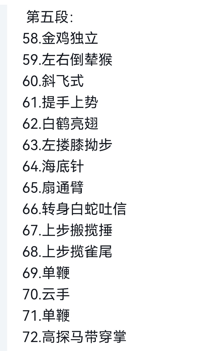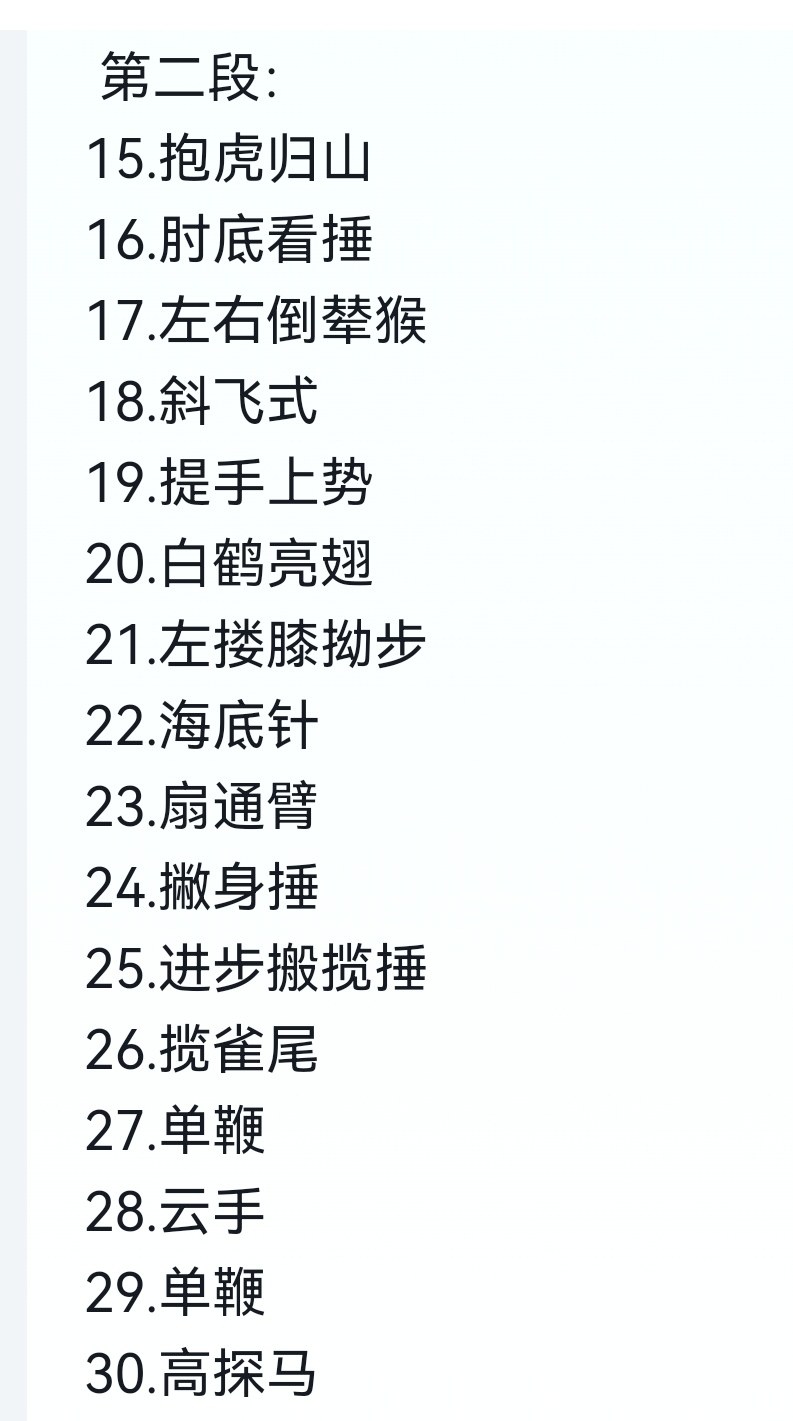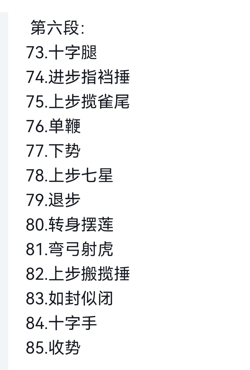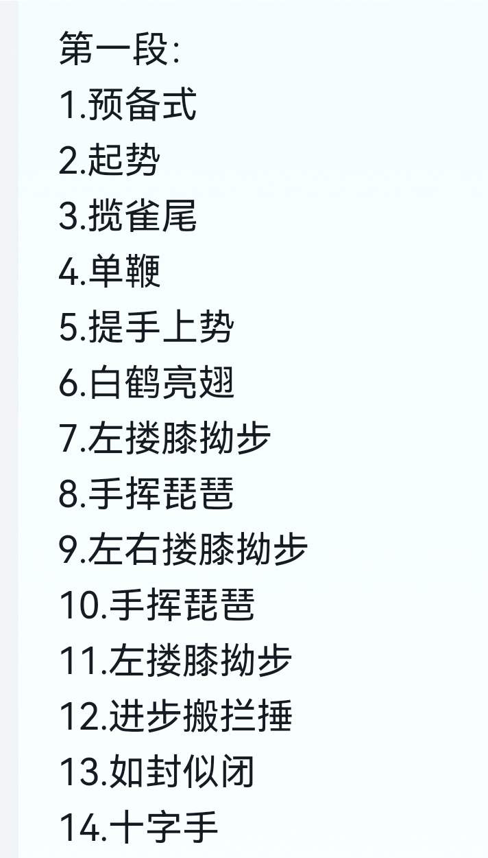 1、起势;2、揽雀尾;3、单鞭;4、提手上势;5、白鹤亮翅;6、搂膝拗步;上步揽雀尾;单鞭;提手上势;白鹤亮翅;搂膝拗步;上步揽雀尾;单鞭;提手上势;白鹤亮翅;搂膝拗步;7、十字手;8、收势。
