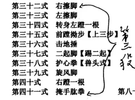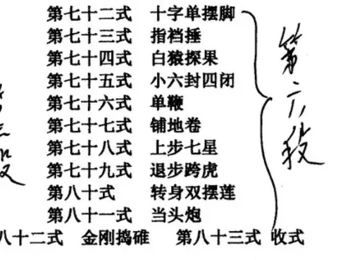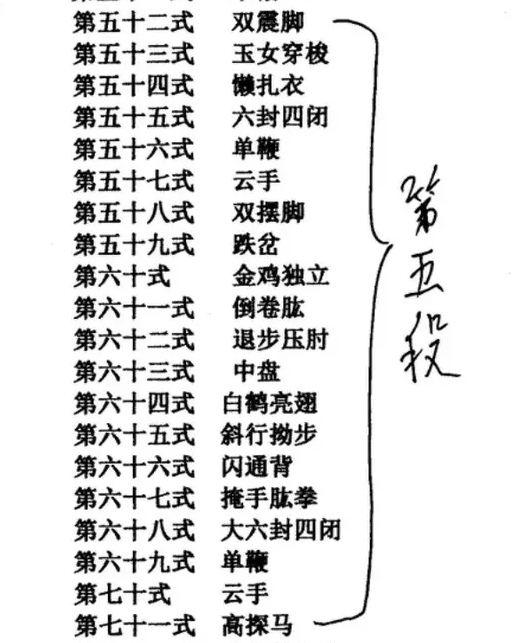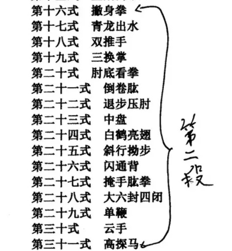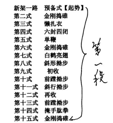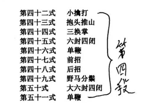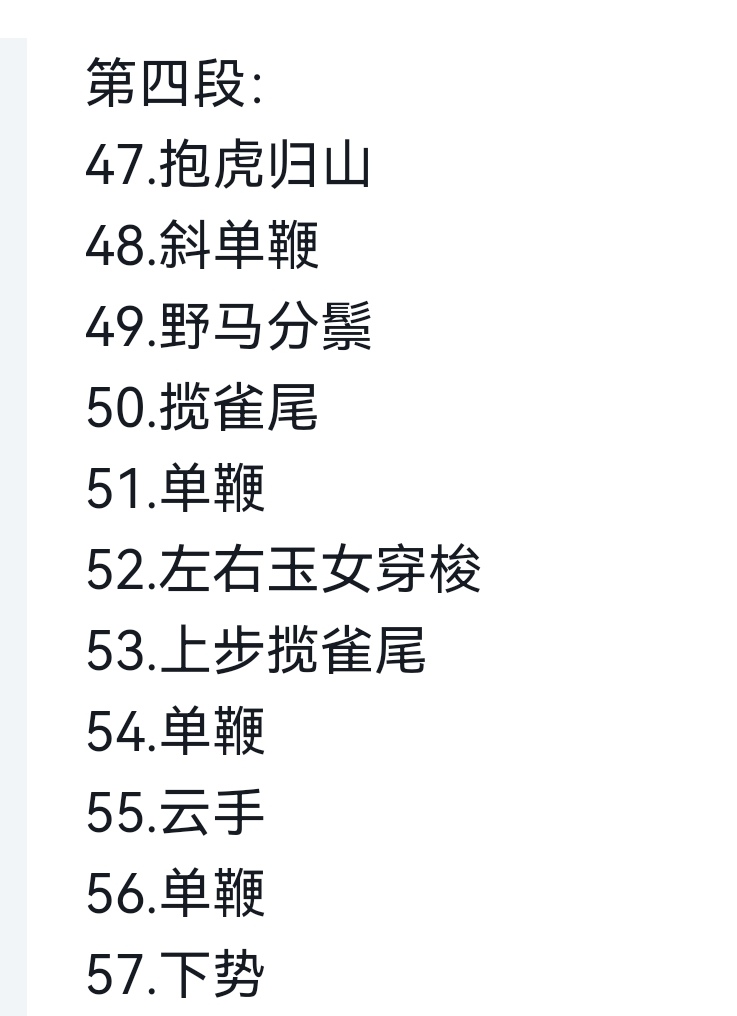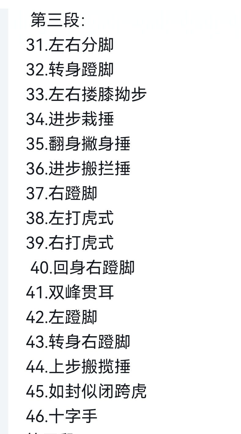 1、起势;2、揽雀尾;3、单鞭;4、提手上势;5、白鹤亮翅;6、搂膝拗步;上步揽雀尾;单鞭;提手上势;白鹤亮翅;搂膝拗步;上步揽雀尾;单鞭;提手上势;白鹤亮翅;搂膝拗步;7、十字手;8、收势。