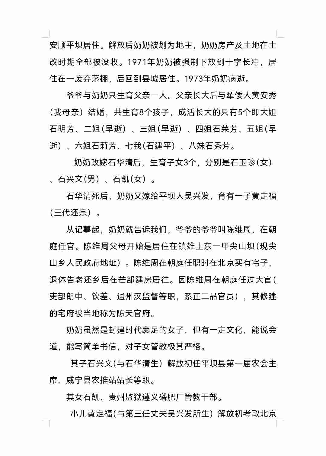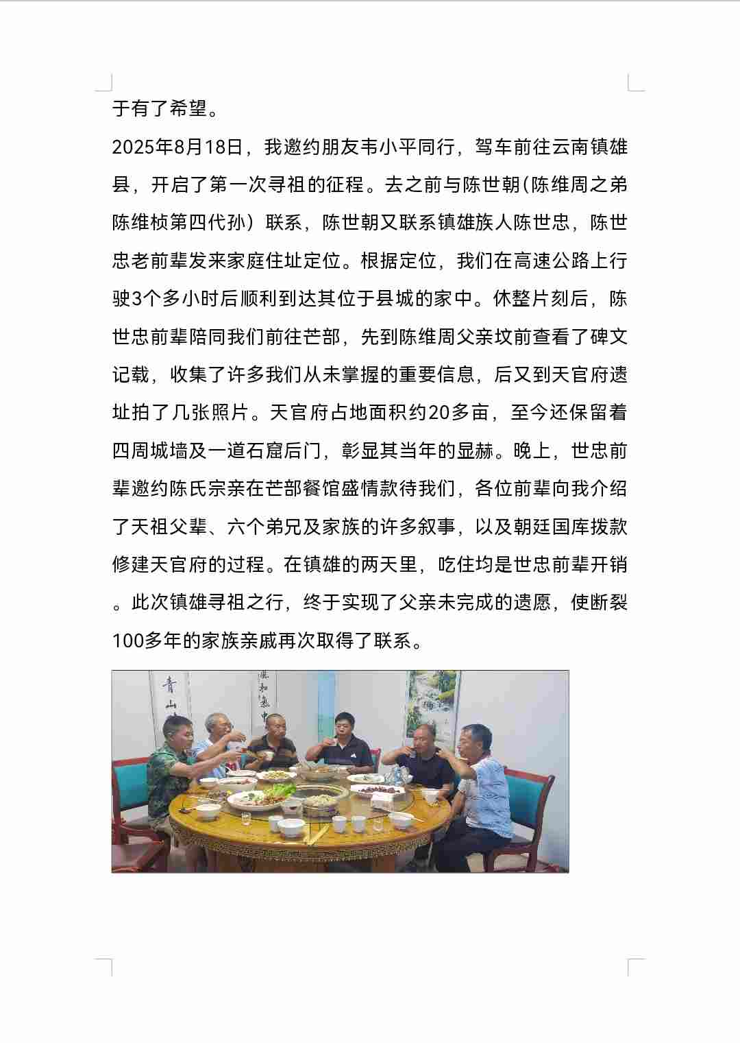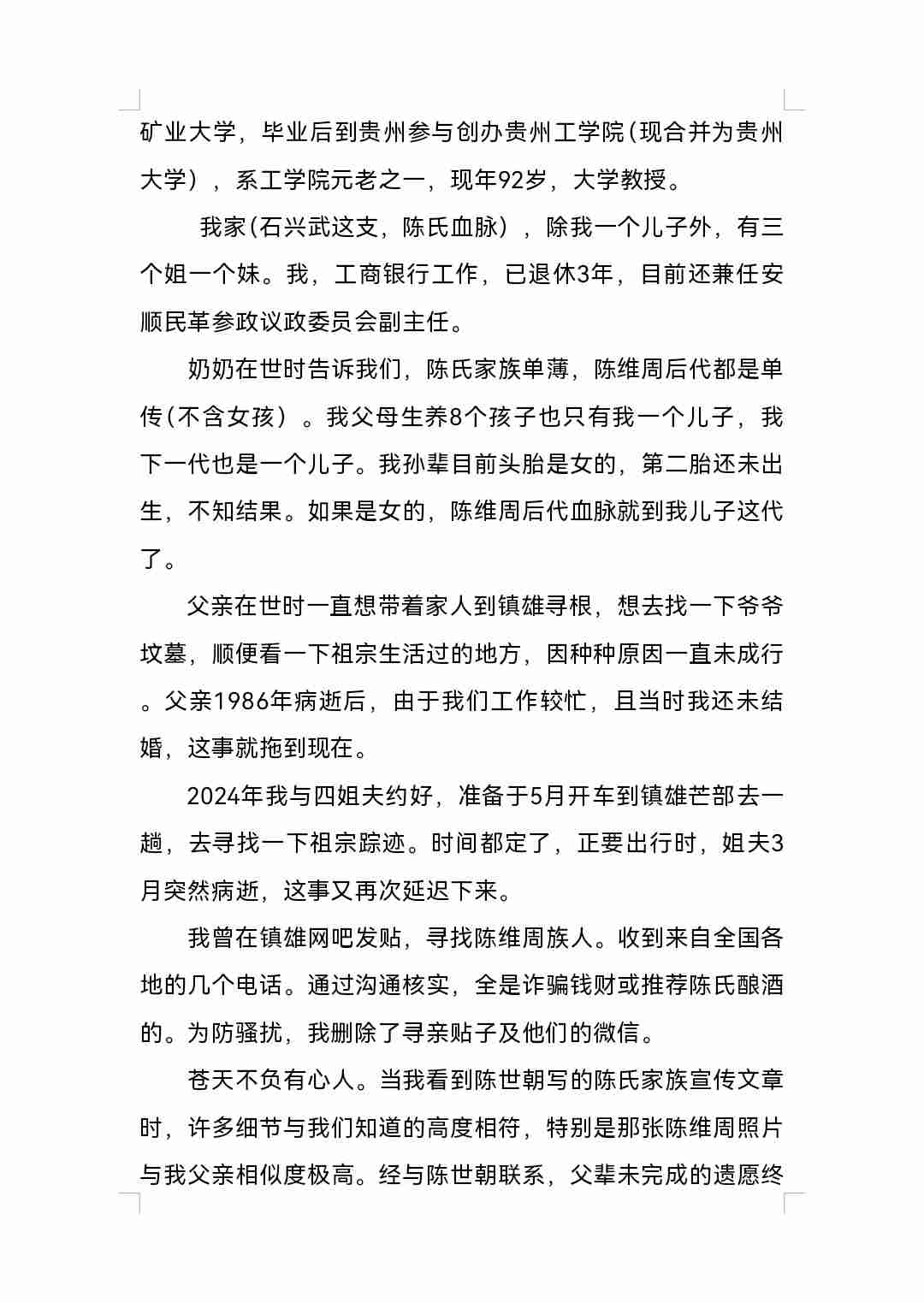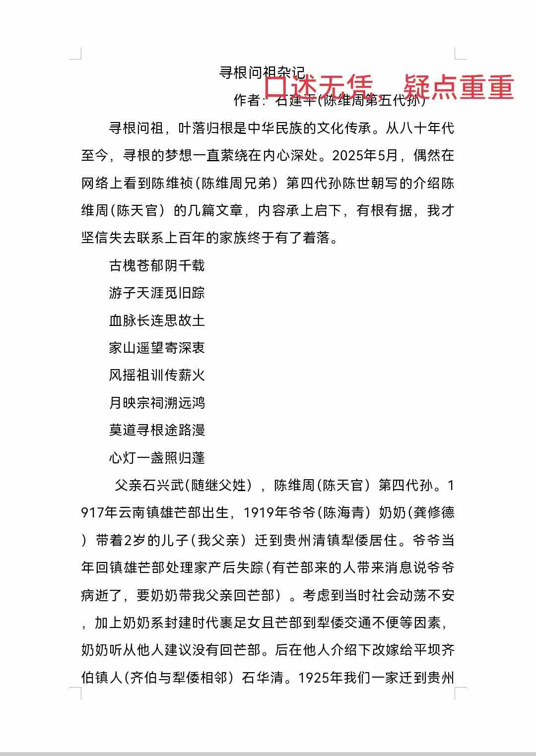 寻根问祖,叶落归根是中华民族的文化传承。从八十年代至今,寻根的梦想一直萦绕在内心深处。2025年5月,偶然在网络上看到陈维祯(陈维周兄弟)第四代孙陈世朝写的介绍陈维周(陈天官)的几篇文章,内容承上启下,有根有据,我才坚信失去联系上百年的家族终于有了着落。 古槐苍郁阴千载 游子天涯觅旧踪 血脉长连思故土 家山遥望寄深衷 风摇祖训传薪火 月映宗祠溯远鸿 莫道寻根途路漫 心灯一盏照归蓬 父亲石兴武(随继父姓),陈维周(陈天官)第四代孙。1917年云南镇雄芒部出生,1919年爷爷(陈海青)奶奶(龚修德)带着2岁的儿子(我父亲)迁到贵州清镇犁倭居住。爷爷当年回镇雄芒部处理家产后失踪(有芒部来的人带来消息说爷爷病逝了,要奶奶带我父亲回芒部)。考虑到当时社会动荡不安,加上奶奶系封建时代裹足女且芒部到犁倭交通不便等因素,奶奶听从他人建议没有回芒部。后在他人介绍下改嫁给平坝齐伯镇人(齐伯与犁倭相邻)石华清。1925年我们一家迁到贵州安顺平坝居住。解放后奶奶被划为地主,奶奶房产及土地在土改时期全部被没收。1971年奶奶被强制下放到十字长冲,居住在一废弃茅棚,后回到县城居住。1973年奶奶病逝。 爷爷与奶奶只生育父亲一人。父亲长大后与犁倭人黄安秀(我母亲)结婚,共生育8个孩子,成活长大的只有5个即大姐石明芳、二姐(早逝)、三姐(早逝)、四姐石荣芳、五姐(早逝)、六姐石莉芳、七我(石建平)、八妹石秀芳。 奶奶改嫁石华清后,生育子女3个,分别是石玉珍(女)、石兴文(男)、石凯(女)。 石华清死后,奶奶又嫁给平坝人吴兴发,育有一子黄定福(三代还宗)。 从记事起,奶奶就告诉我们,爷爷的爷爷叫陈维周,在朝庭任官。陈维周父母开始是居住在镇雄上东一甲尖山坝(现尖山乡人民政府地址)。陈维周在朝庭任职时在北京买有宅子,退休告老还乡后在芒部建房居往。因陈维周在朝庭任过大官(吏部朗中、钦差、通州汉监督等职,系正二品官员),其修建的宅府被当地称为陈天官府。 奶奶虽然是封建时代裹足的女子,但有一定文化,能说会道,能写简单书信,对子女管教极其严格。 其子石兴文(与石华清生)解放初任平坝县第一届农会主席、威宁县农推站站长等职。 其女石凯,贵州监狱遵义磷肥厂管教干部。 小儿黄定福(与第三任丈夫吴兴发所生)解放初考取北京矿业大学,毕业后到贵州参与创办贵州工学院(现合并为贵州大学),系工学院元老之一,现年92岁,大学教授。 我家(石兴武这支,陈氏血脉),除我一个儿子外,有三个姐一个妹。我,工商银行工作,已退休3年,目前还兼任安顺民革参政议政委员会副主任。 奶奶在世时告诉我们,陈氏家族单薄,陈维周后代都是单传(不含女孩)。我父母生养8个孩子也只有我一个儿子,我下一代也是一个儿子。我孙辈目前头胎是女的,第二胎还未出生,不知结果。如果是女的,陈维周后代血脉就到我儿子这代了。父亲在世时一直想带着家人到镇雄寻根,想去找一下爷爷坟墓,顺便看一下祖宗生活过的地方,因种种原因一直未成行。父亲1986年病逝后,由于我们工作较忙,且当时我还未结婚,这事就拖到现在。2024年我与四姐夫约好,准备于5月开车到镇雄芒部去一趟,去寻找一下祖宗踪迹。时间都定了,正要出行时,姐夫3月突然病逝,这事又再次延迟下来。 我曾在镇雄网吧发贴,寻找陈维周族人。收到来自全国各地的几个电话。通过沟通核实,全是诈骗钱财或推荐陈氏酿酒的。为防骚扰,我删除了寻亲贴子及他们的微信。 苍天不负有心人。当我看到陈世朝写的陈氏家族宣传文章时,许多细节与我们知道的高度相符,特别是那张陈维周照片与我父亲相似度极高。经与陈世朝联系,父辈未完成的遗愿终于有了希望。2025年8月18日,我邀约朋友韦小平同行,驾车前往云南镇雄县,开启了第一次寻祖的征程。去之前与陈世朝(陈维周之弟陈维桢第四代孙)联系,陈世朝又联系镇雄族人陈世忠,陈世忠老前辈发来家庭住址定位。根据定位,我们在高速公路上行驶3个多小时后顺利到达其位于县城的家中。休整片刻后,陈世忠前辈陪同我们前往芒部,先到陈维周父亲坟前查看了碑文记载,收集了许多我们从未掌握的重要信息,后又到天官府遗址拍了几张照片。天官府占地面积约20多亩,至今还保留着四周城墙及一道石窟后门,彰显其当年的显赫。晚上,世忠前辈邀约陈氏宗亲在芒部餐馆盛情款待我们,各位前辈向我介绍了天祖父辈、六个弟兄及家族的许多叙事,以及朝廷国库拨款修建天官府的过程。在镇雄的两天里,吃住均是世忠前辈开销。此次镇雄寻祖之行,终于实现了父亲未完成的遗愿,使断裂100多年的家族亲戚再次取得了联系。