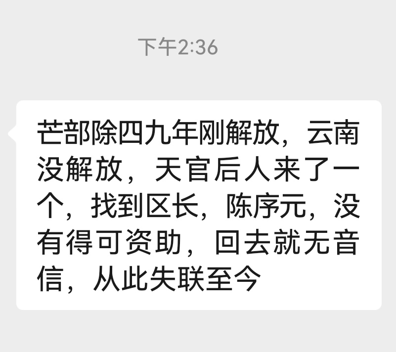 另据悉,天官后人中一人序字辈,于1949年回镇雄一次后失联。由此及族谱记载得知:天官后人的字排为:……维宗之序……。