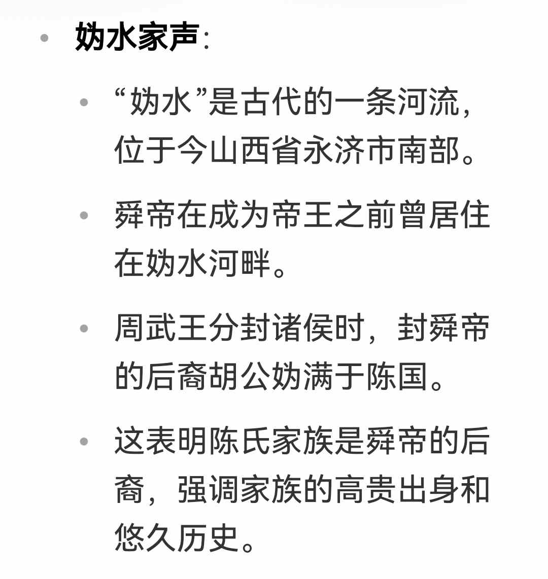 “妫汭”是指陈姓是舜帝的后代,这是也有历史根据的:舜为帝之前,居妫汭河(在今山西永济南,源出历山,西流入黄河)边。后来周武王分封诸侯时,封舜帝的后裔胡公妫满于陈国(今河南省东部和安徽省一部分),建都宛丘(今河南省淮阳县)。公元前479年,楚灭陈。陈厉公之子完逃奔齐国,其子孙遂以陈为姓氏。