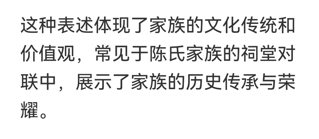 这种表述体现了家族的文化传统和价值观,常见于陈氏家族的祠堂对联中,展示了家族的历史传承与荣耀。