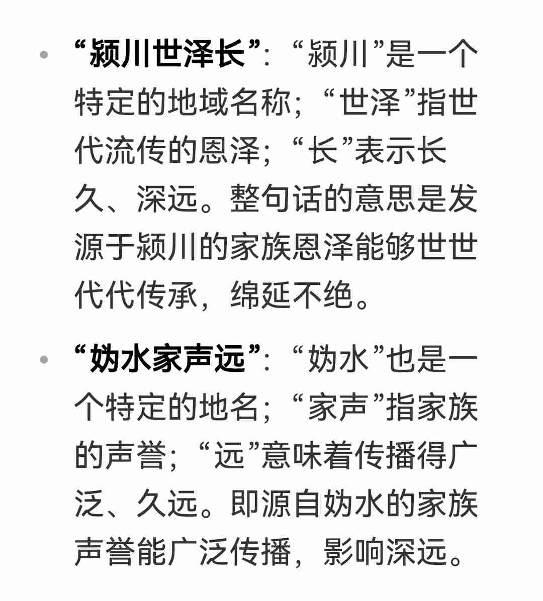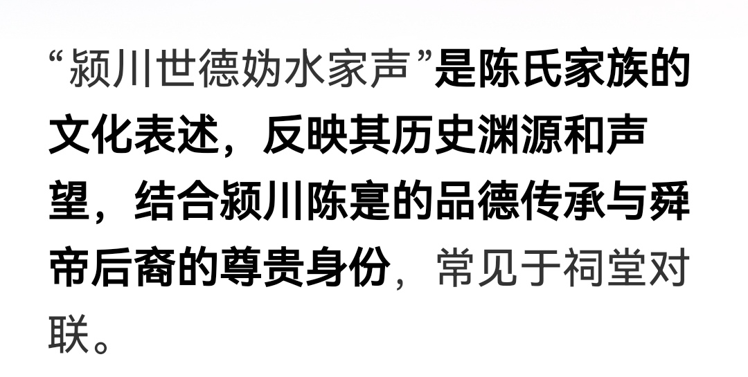 “颍川世德,妫水家声”,是陈氏家族的文化表述,反映其历史渊源和声望,结合颍川陈寔的品德传承与舜帝后裔的尊贵身份,常见于祠堂对联。